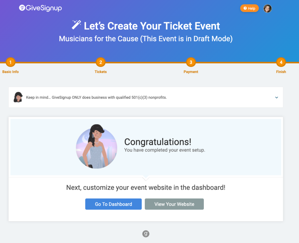 - Finish: You have created a website and are ready to sell tickets and accept donations! Add more customization to your website and ticket event from the Ticket Event Dashboard.