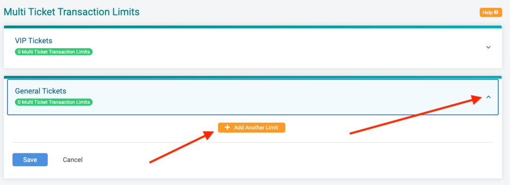 From your ticket event dashboard, navigate to Tickets >> Transaction Limits for a submenu of all options available to configure ticket transactions.