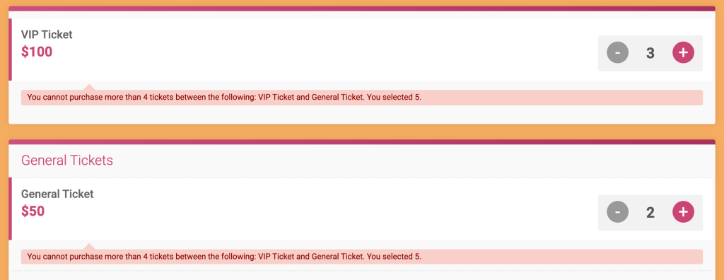 Exceeding the limit will again show the ticket purchaser error messages with helpful text indicating what the limit is and to which tickets the limit applies.