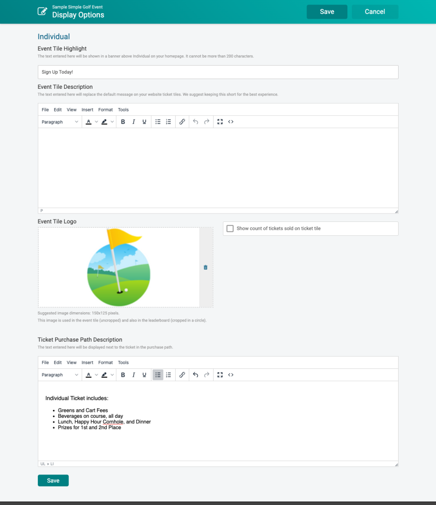 You can set up more or less ticket options for your golf event! You’ll also be able to add more and edit these ticket options at anytime from your Dashboard.