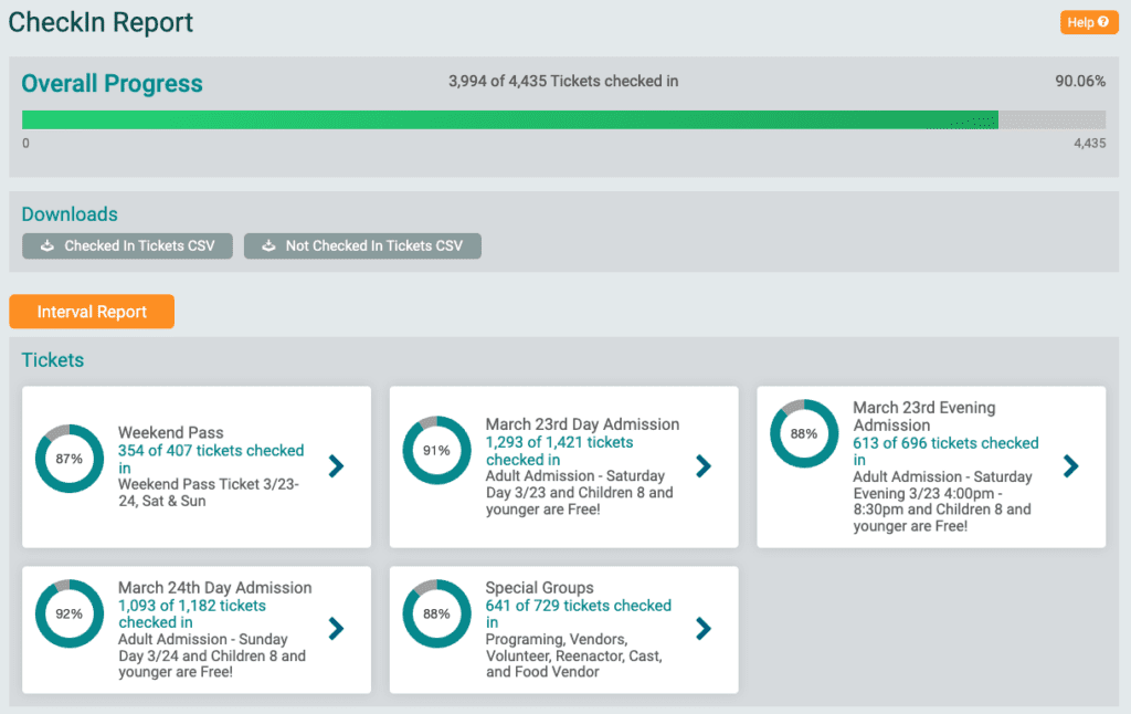 One of TicketSignup’s most popular features is the free mobile Ticket App. From scanning tickets to fulfilling merch on site, the Ticket App make events simple and smooth. The CheckIns by Ticket Report lets you view stats on checkins vs. purchased tickets for all tickets, and broken down by ticket type. The CheckIn Interval Report lets you drill down into 5, 10, 30, or 60 minute intervals to view the total number of check-ins throughout the event. In addition, you can export a summary of the intervals and checkin count. This helps you better understand throughput and when you need more (or fewer) staff.