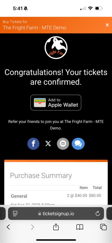 TicketSignup’s platform is built for mobile transactions. Over 75% of all ticket website traffic and sales come from mobile devices. More than 35% of guests complete checkouts with Apple Pay. Once attendees checkout, they are prompted to share with friends and add their tickets to their digital wallet. Haunts need a modern ticketing platform for pre sales and on site sale – make it easy for attendees to buy tickets wherever they are!