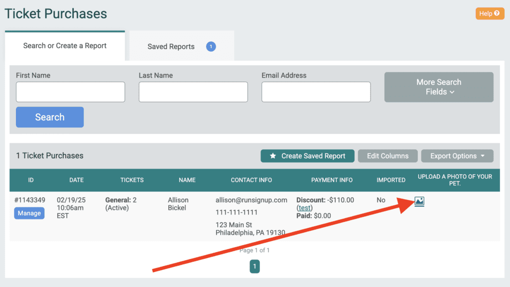 The image is currently accessible via the Ticket Purchase or Individual Tickets report when viewing the Custom Questions column. You can use Saved Reports to create a report that always displays this column. When you click on the image link, a new window will open with the file.