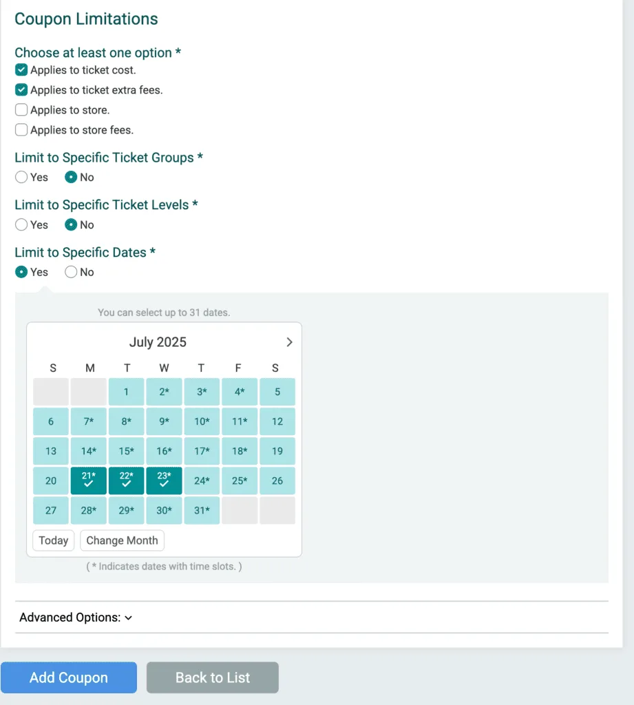 Fill slower days with targeted discounts. Apply coupons to specific dates so you can balance attendance and drive more sales across your calendar.