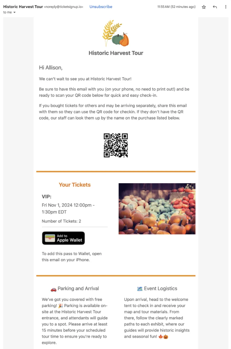 Set up and customize in minutes. For example, schedule emails 1 week and 1 day before attendees come to the event. Promote ticket upgrades and upsell add-ons before the event. Then cross-promote other events and special offers in your follow-up. Plus it’s 100% free.