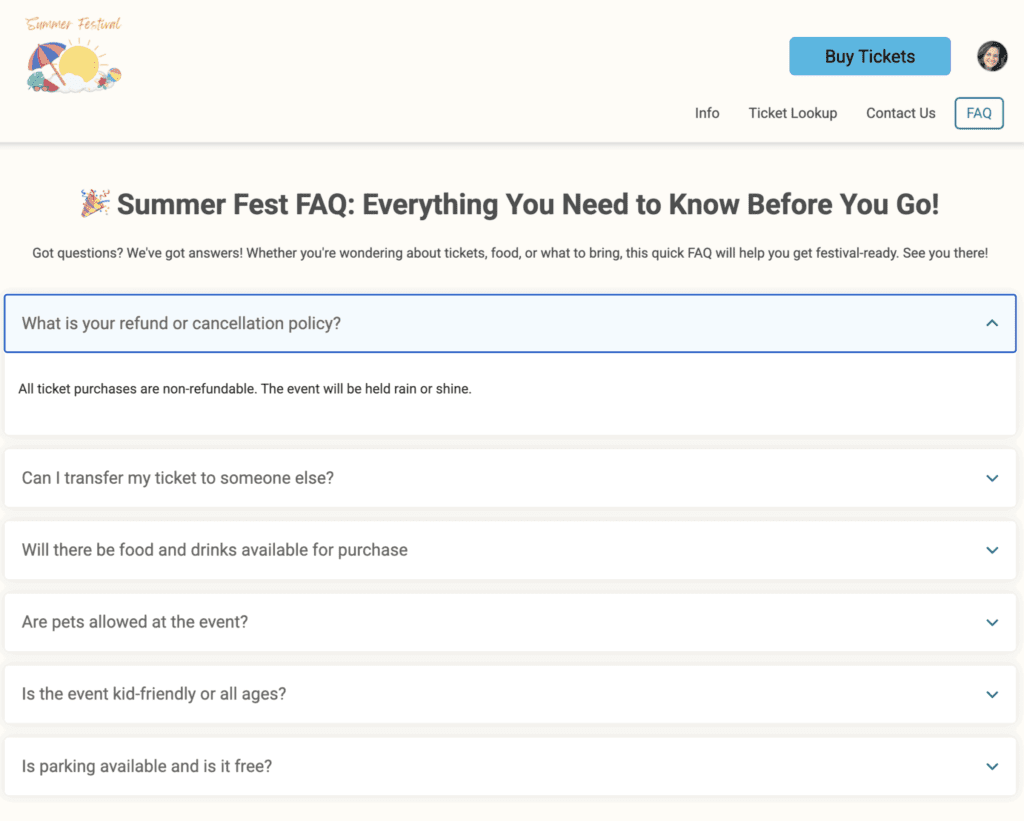 Answer common questions before they hit your inbox. Add a mobile-friendly FAQ section to your event website so attendees get quick answers.