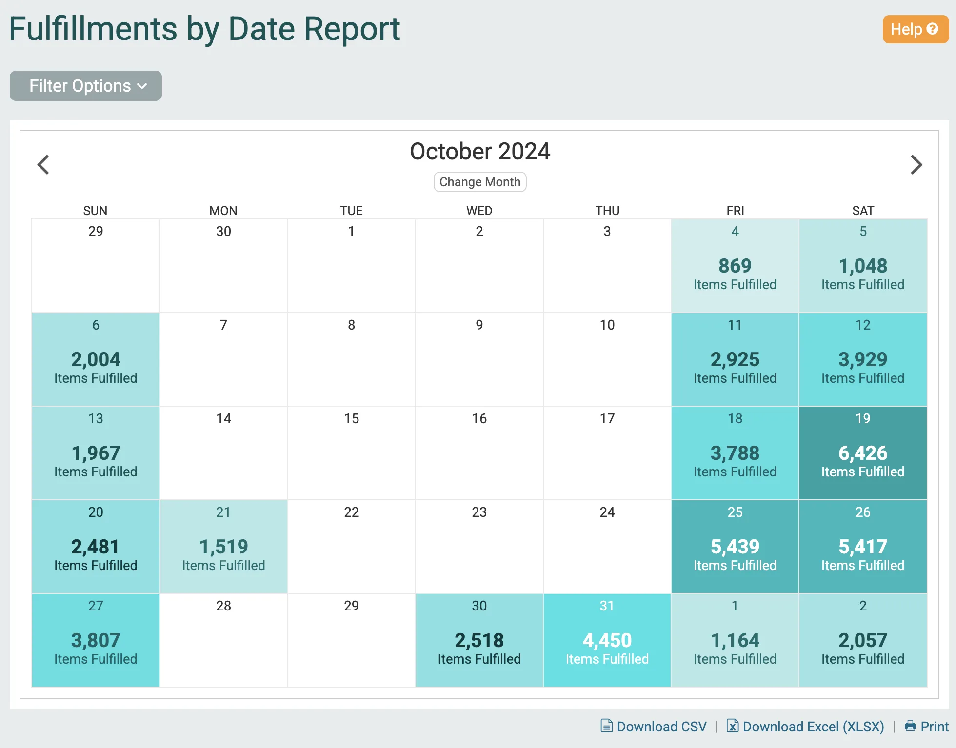 The report displays a monthly calendar where each date shows the total number of items fulfilled. Shading highlights days with higher fulfillment volumes, giving organizers a quick visual indicator of peak periods. This high-level view is particularly valuable for multi-day events like festivals, haunts, and light shows, where fulfillment trends vary across the season.