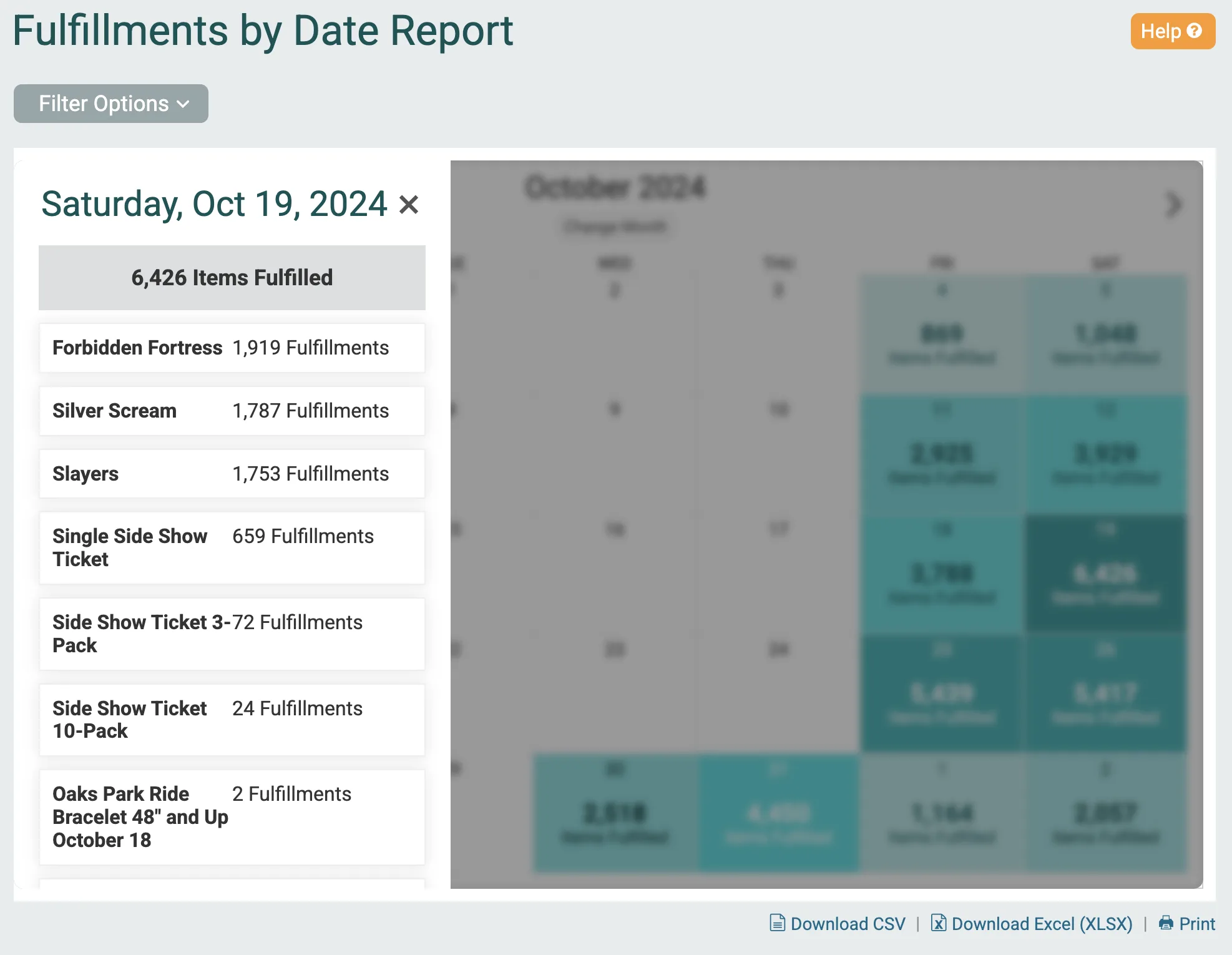 Clicking on a specific date reveals a breakdown of fulfillments by item. This allows organizers to analyze which products or experiences contributed to the day’s total. For example, a haunt can see how many guests checked in to each attraction per date, while a holiday light show can review fulfillment of add-ons like glow sticks.