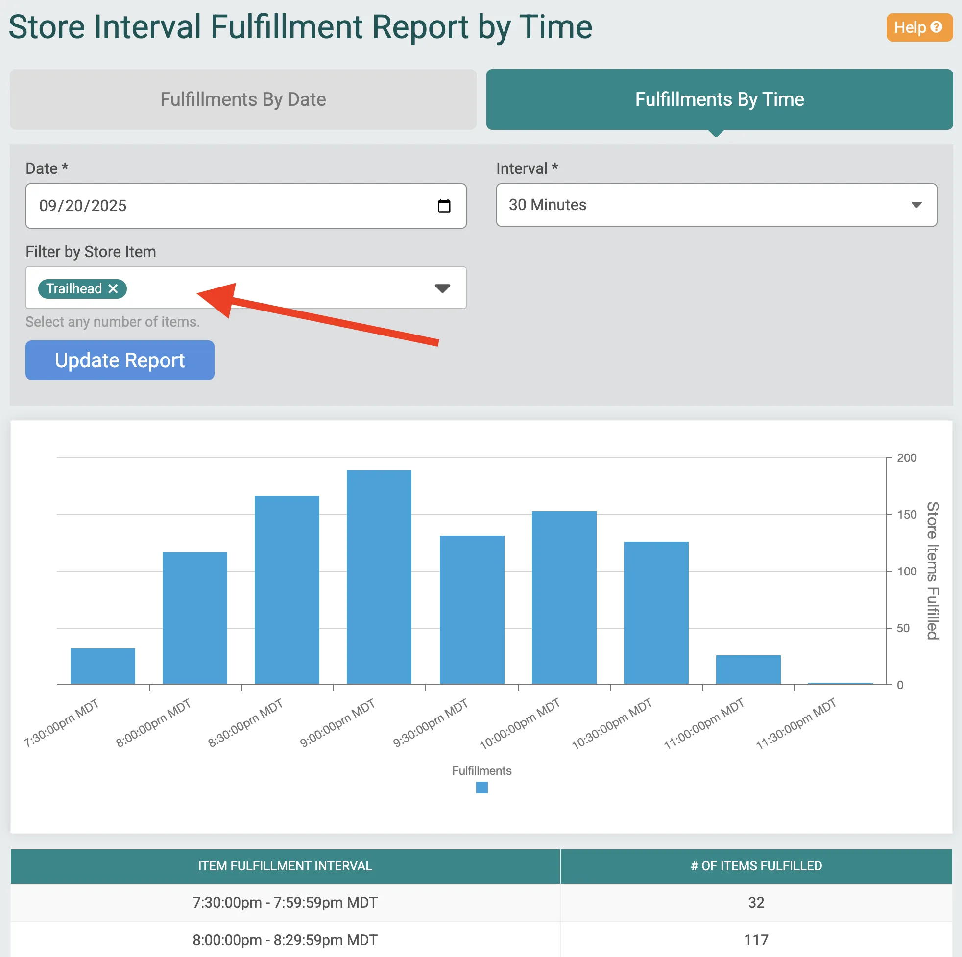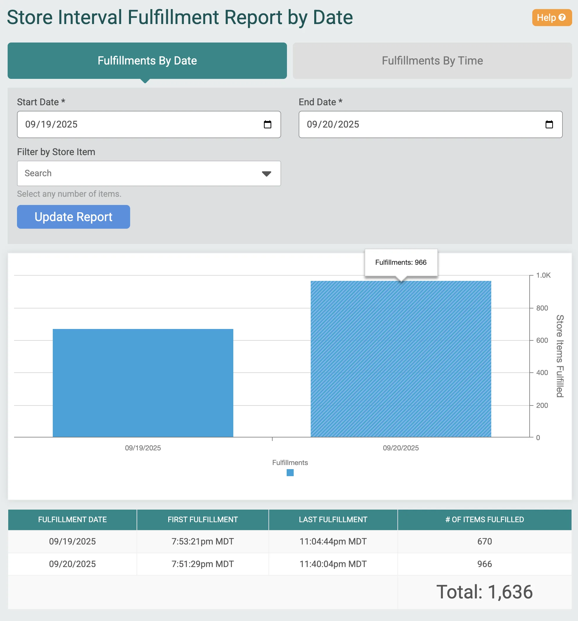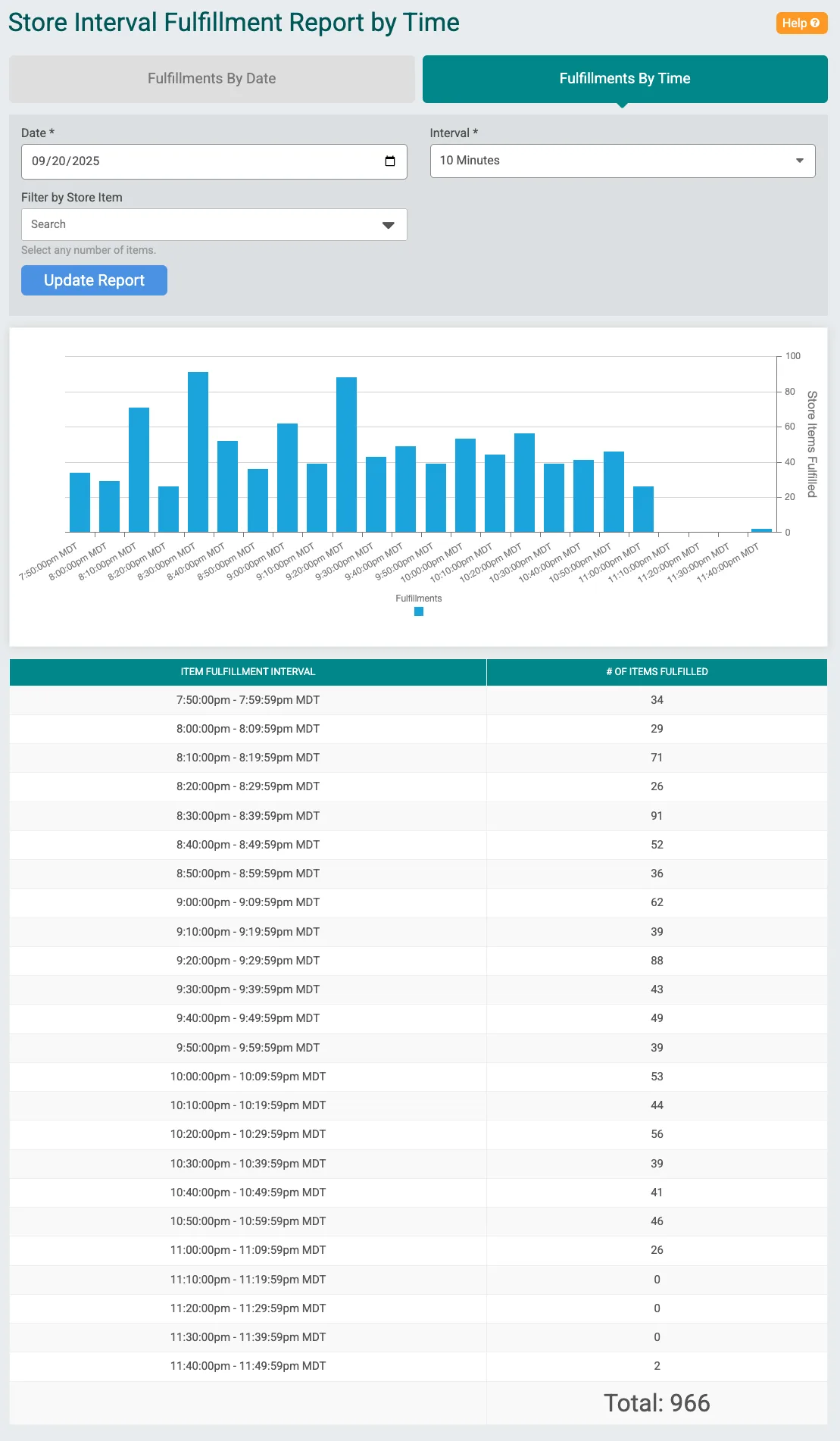 Click the Fulfillments by Time tab to view this report. Then enter a date a select a time interval.