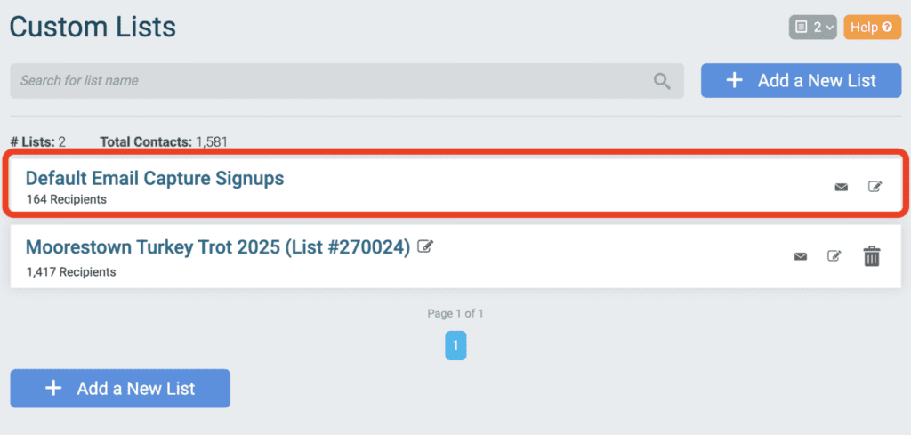 You can access contacts who sign up via the newsletter sign up component and/or the Email Capture popup by going to Email Marketing >> Custom Lists. We automatically create a custom list labeled “Default Email Capture Signups”. Even if you haven’t used the Email Capture popup, TicketSignup automatically creates this list to capture all of your newsletter sign up contacts.