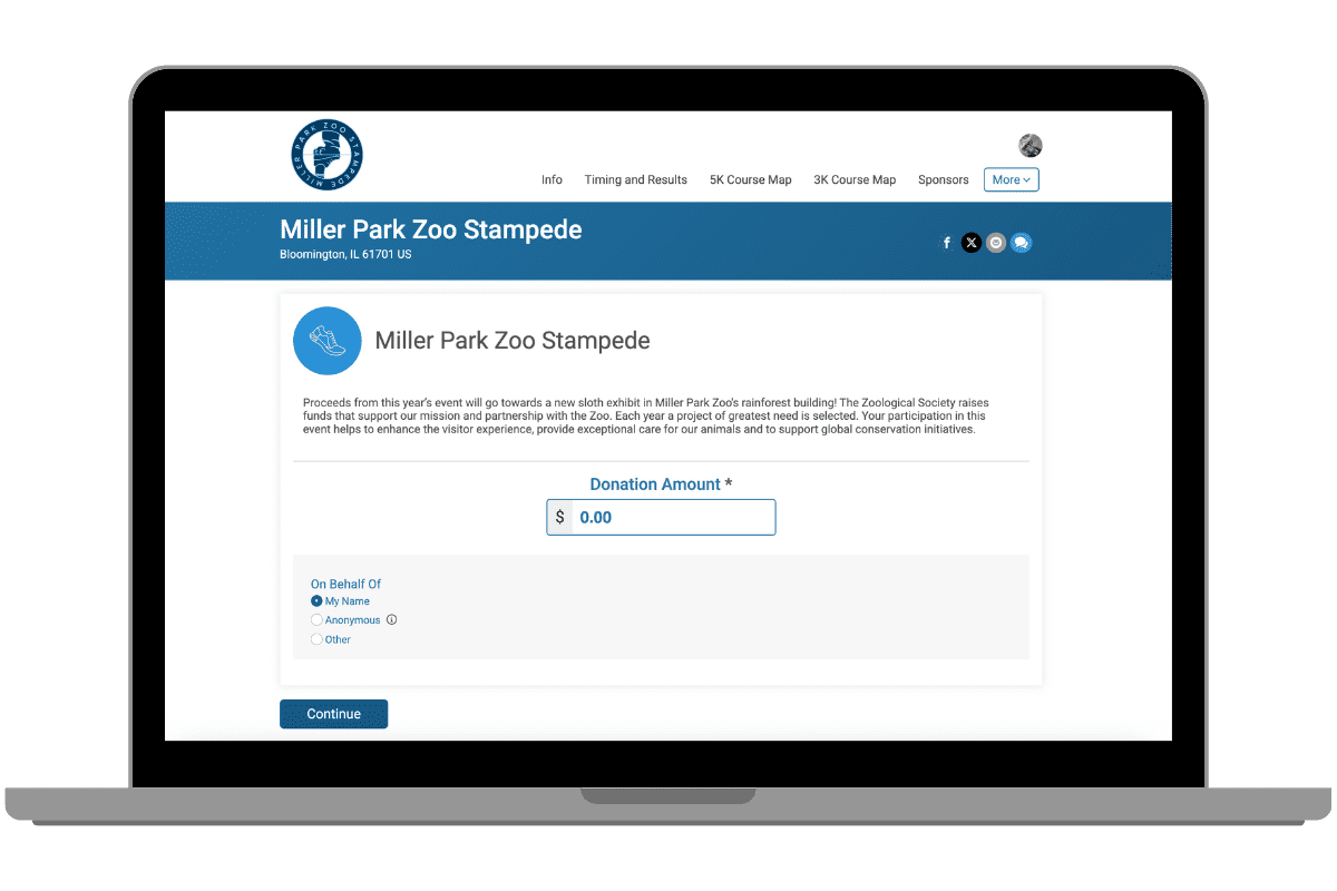 Miller Park Zoo’s annual Zoo Stampede 5K and 3K is more than a race – it’s a community fundraiser. Using RunSignup’s Website V2 builder, they built a mobile-friendly race site that feels polished and professional. They went beyond the basics by adding custom menu options across the top of the page, including dedicated sections for results, race courses, and sponsor recognition. This gives participants an easy way to find everything they need while highlighting the local businesses that support the event.