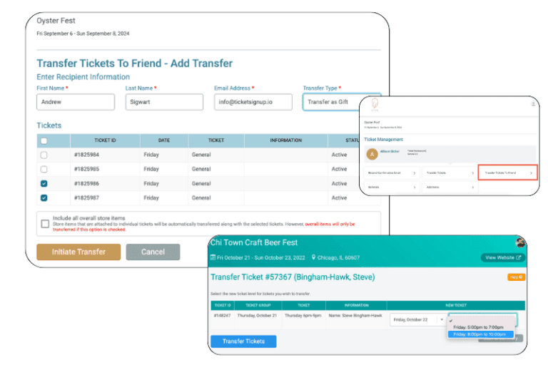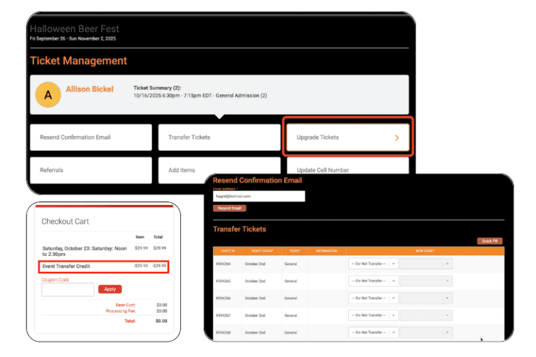 - Offer self-serve ticket management options to empower ticket purchasers to transfer tickets, change days, and upgrade their tickets, within the parameters you set.