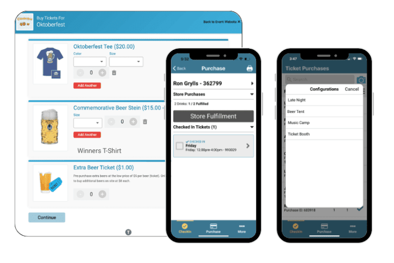 - Fulfill more than tickets. Check in beers, food items, or merch for each ticket – perfect for tastings with a set number of samples per person, or festivals with free admission and paid beer tickets.