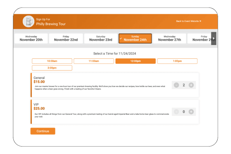 Set up brewery tours and other recurring brewery events with our intuitive calendar-based timed entry ticketing. Track your daily expected guests, manage tour sizes, check-in guests, and automate communications before and after the tour.
