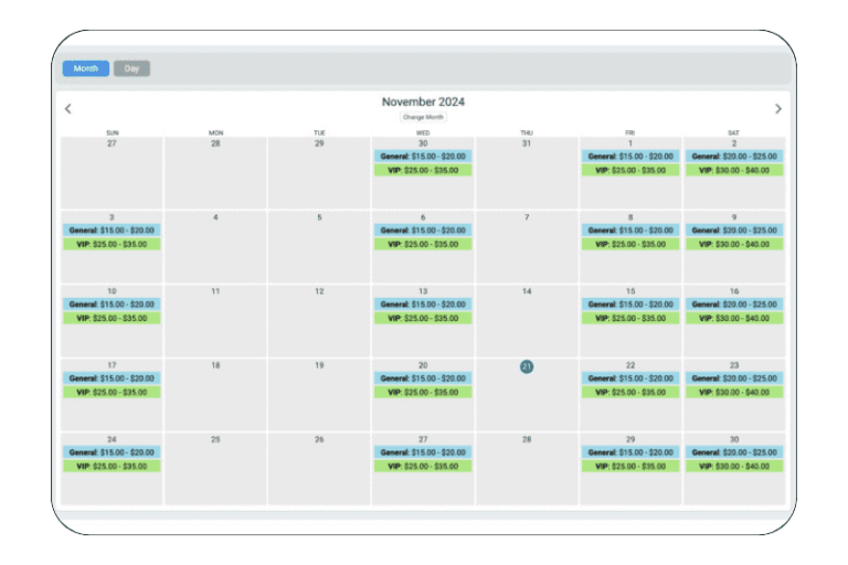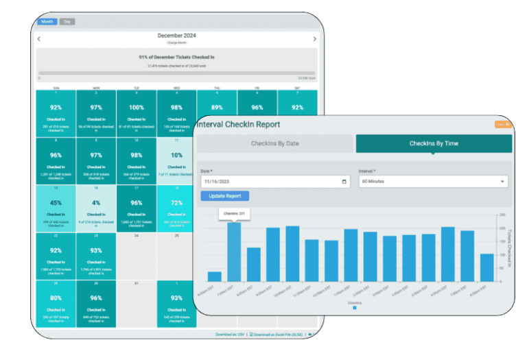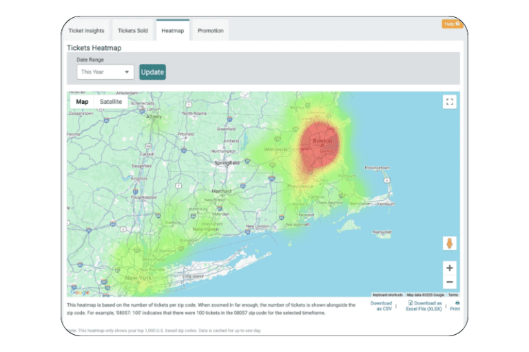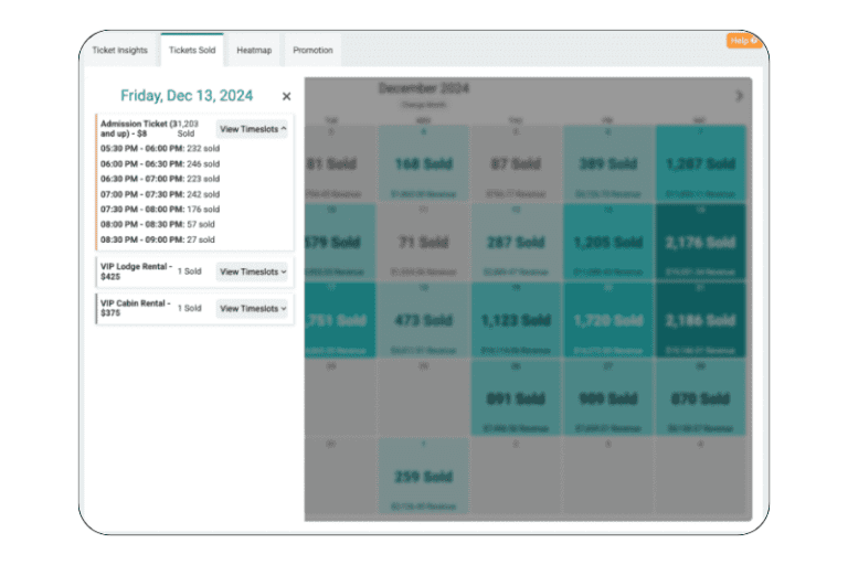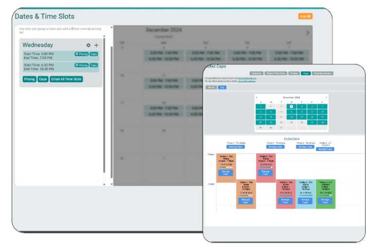 - Real-Time Data: View tickets sold, revenue, and progress toward caps in a simple, color-coded, calendar-based view on your dashboard.