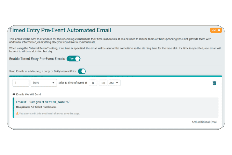 - Automated Emails: Schedule customizable emails to send before a time slot begins and/or after someone purchases tickets.