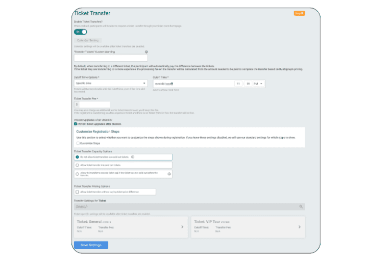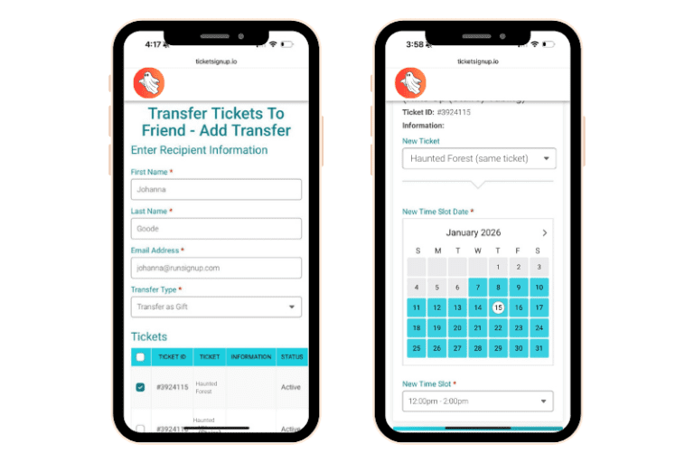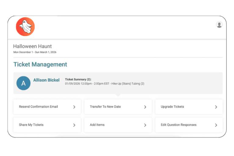 - Self-Serve Options: Allow attendees to transfer tickets to a different time, or transfer tickets to a friend. Set unique rules for ticket transfers depending on the date, time slot, and ticket type.