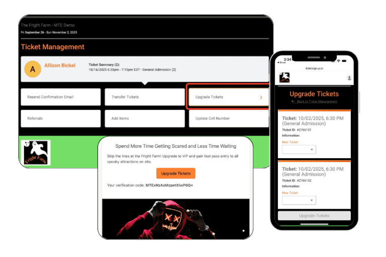 Self-serve upgrades and item add-ons mean per-ticket revenue continues to grow even after the initial purchase. Set up automated emails to encourage upgrades and use on-site signage with QR codes to make it simple for ticket purchasers to add more add-on items and upgrade their ticket even after arrival.