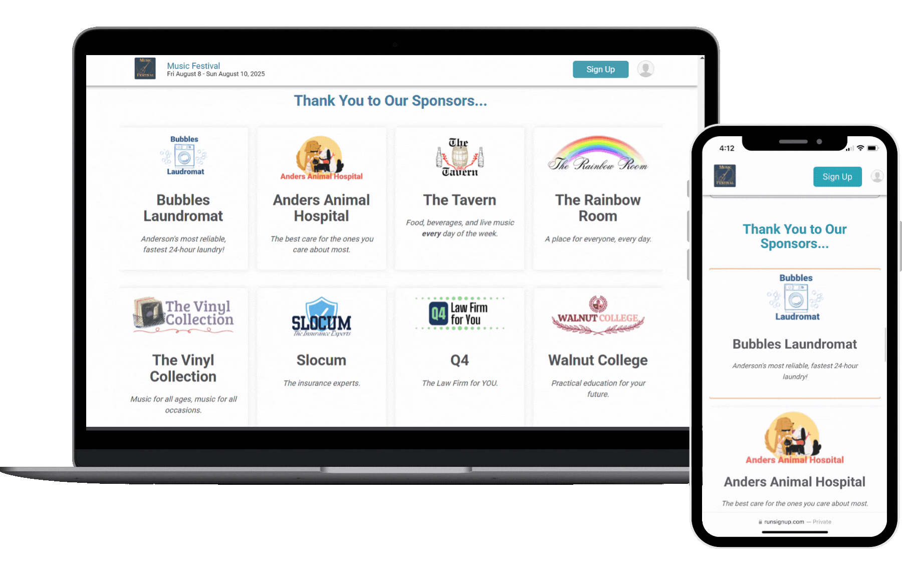 Use TicketSignup to offer Sponsor options with a range of Sponsor Levels and perks. Then, take advantage of website builder and email marketing to promote sponsors to your community!