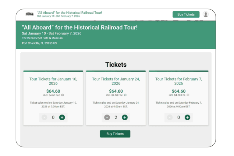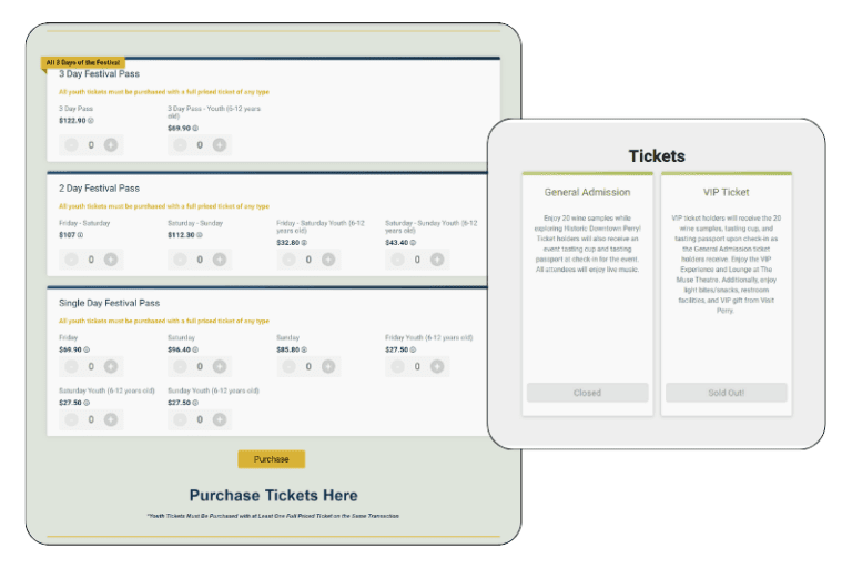 - Ticket options for all types of events, whether you need simple general admission, groupings of ticket options, or multi-day timed entry ticketing.