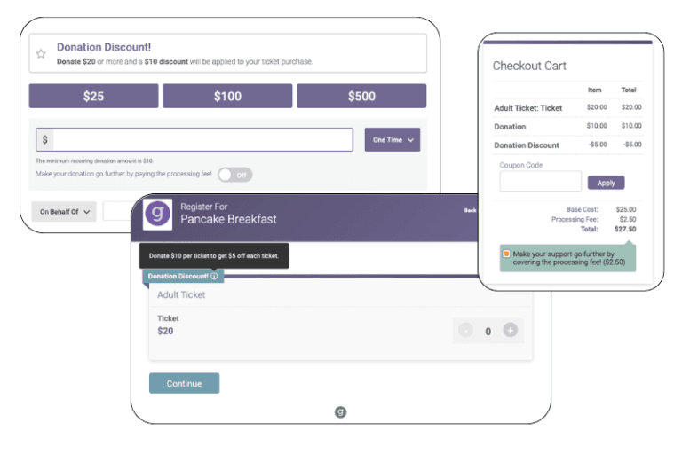 - Give donors (and/or ticket purchasers) the option to cover processing fees and make their donation go further.