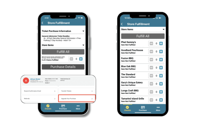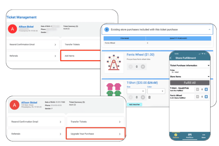 - Fulfill merchandise and upgrades on-site with simple check-in configurations for store items.